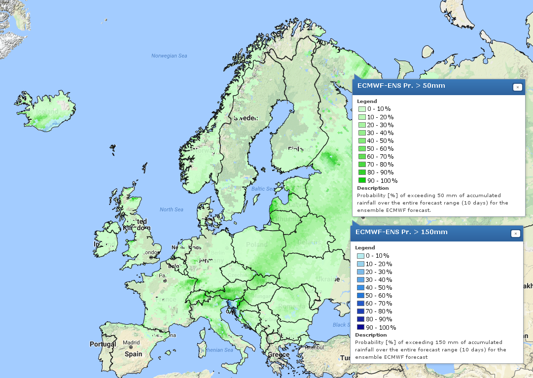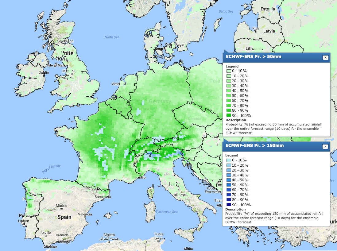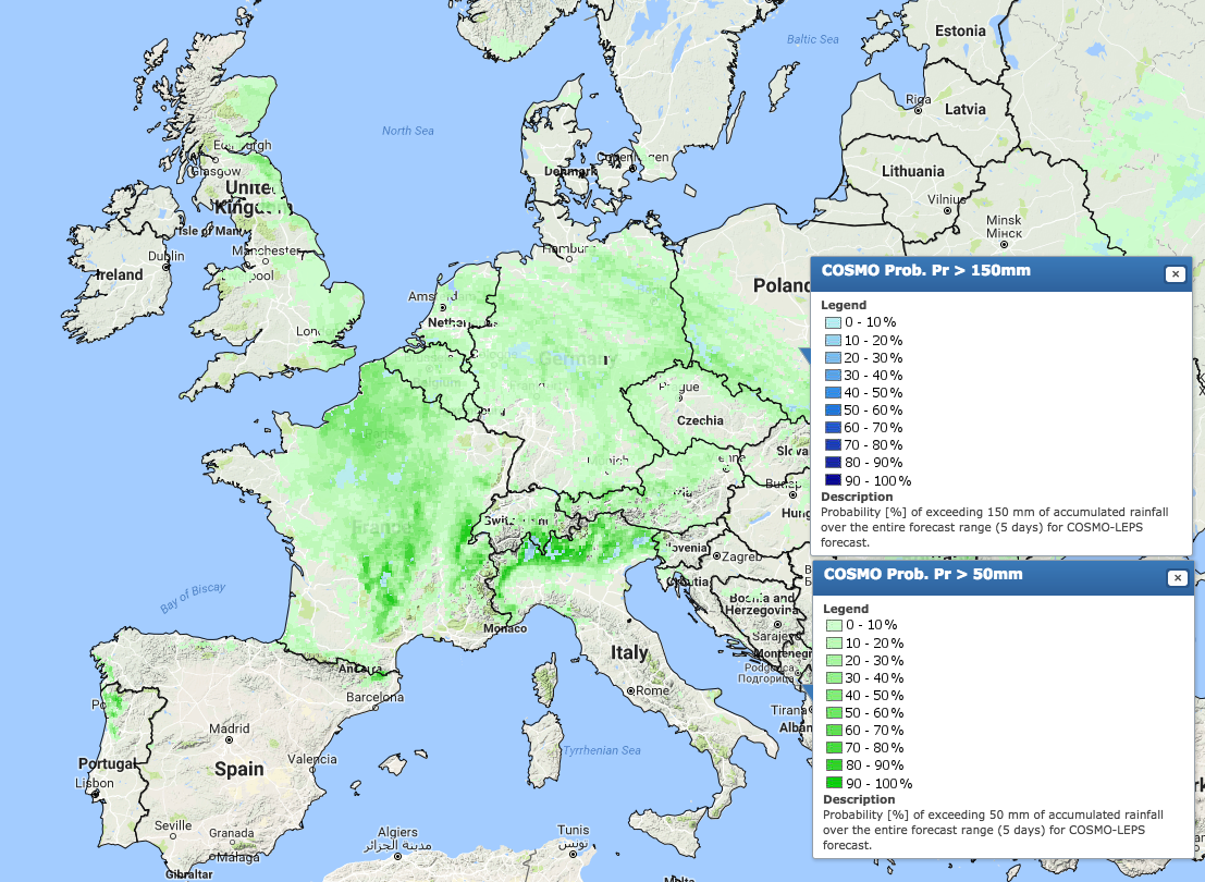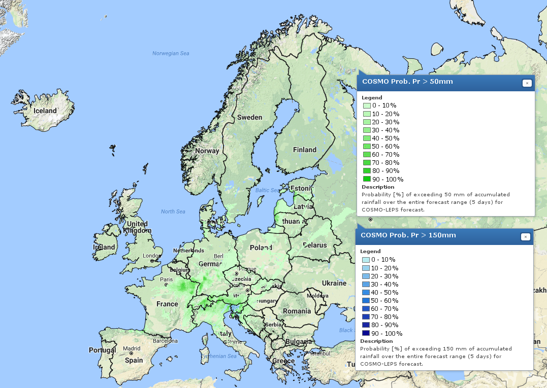 Probability of the ensemble forecasts generated by ECMWF and COSMO-LEPs exceeding 50 or 150 mm over 10 or 5 days respectively.