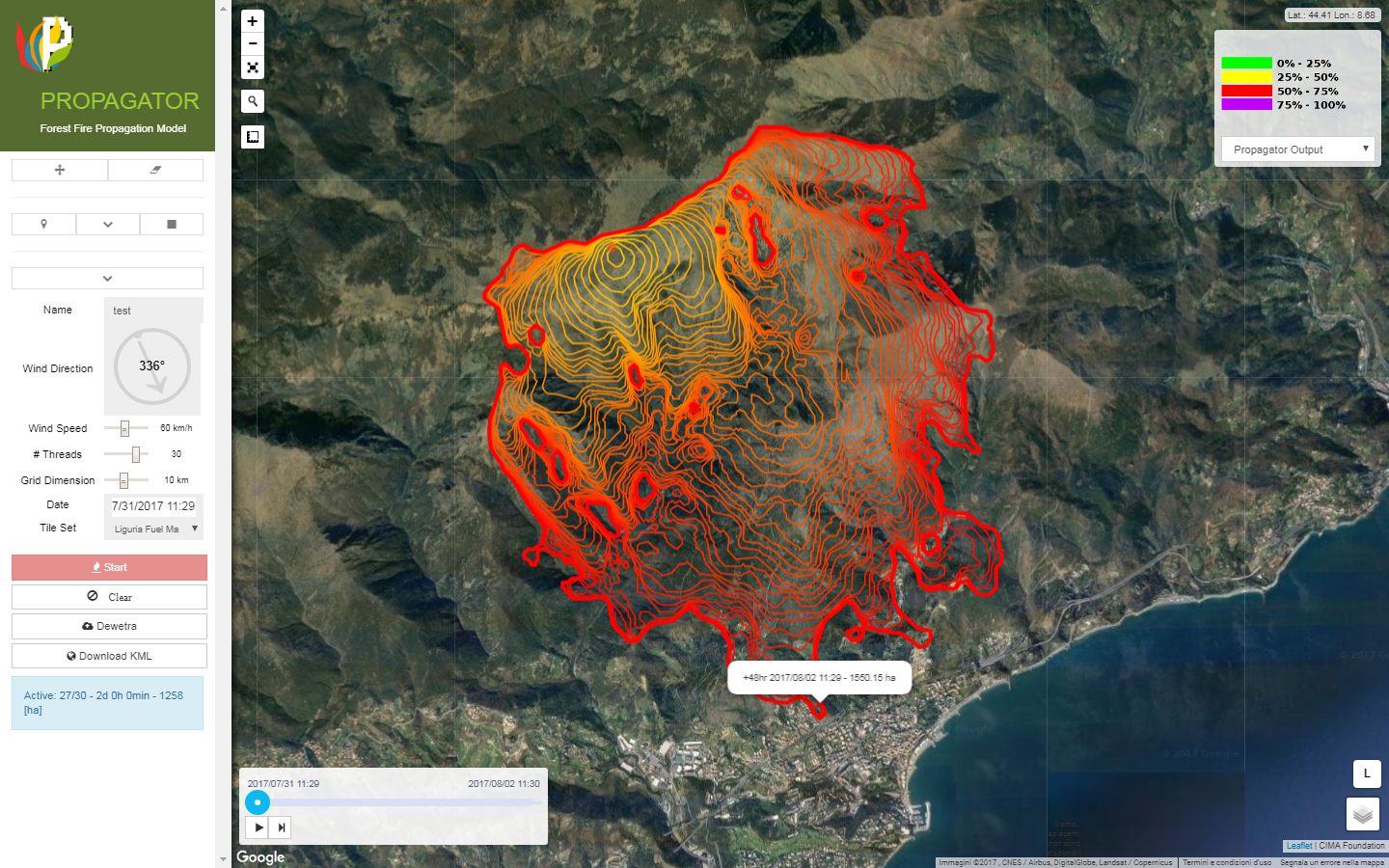 In terms of the probability map it represents the probability map of the burned area each 30 min of simulation. Each pixel is the number of independent simulation, which burnt the pixel itself with respect to the total number of fire simulated.