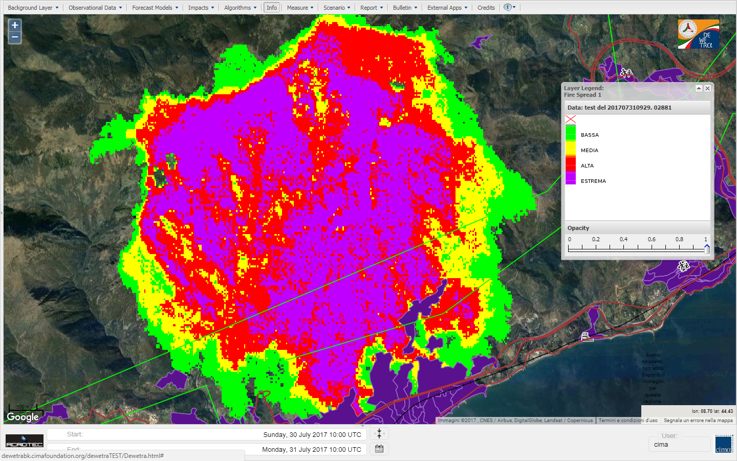 The products are the representation of the burned area and the burned area probability subject to a scenario imposed by the user (ignition point, wind velocity and direction, etc).