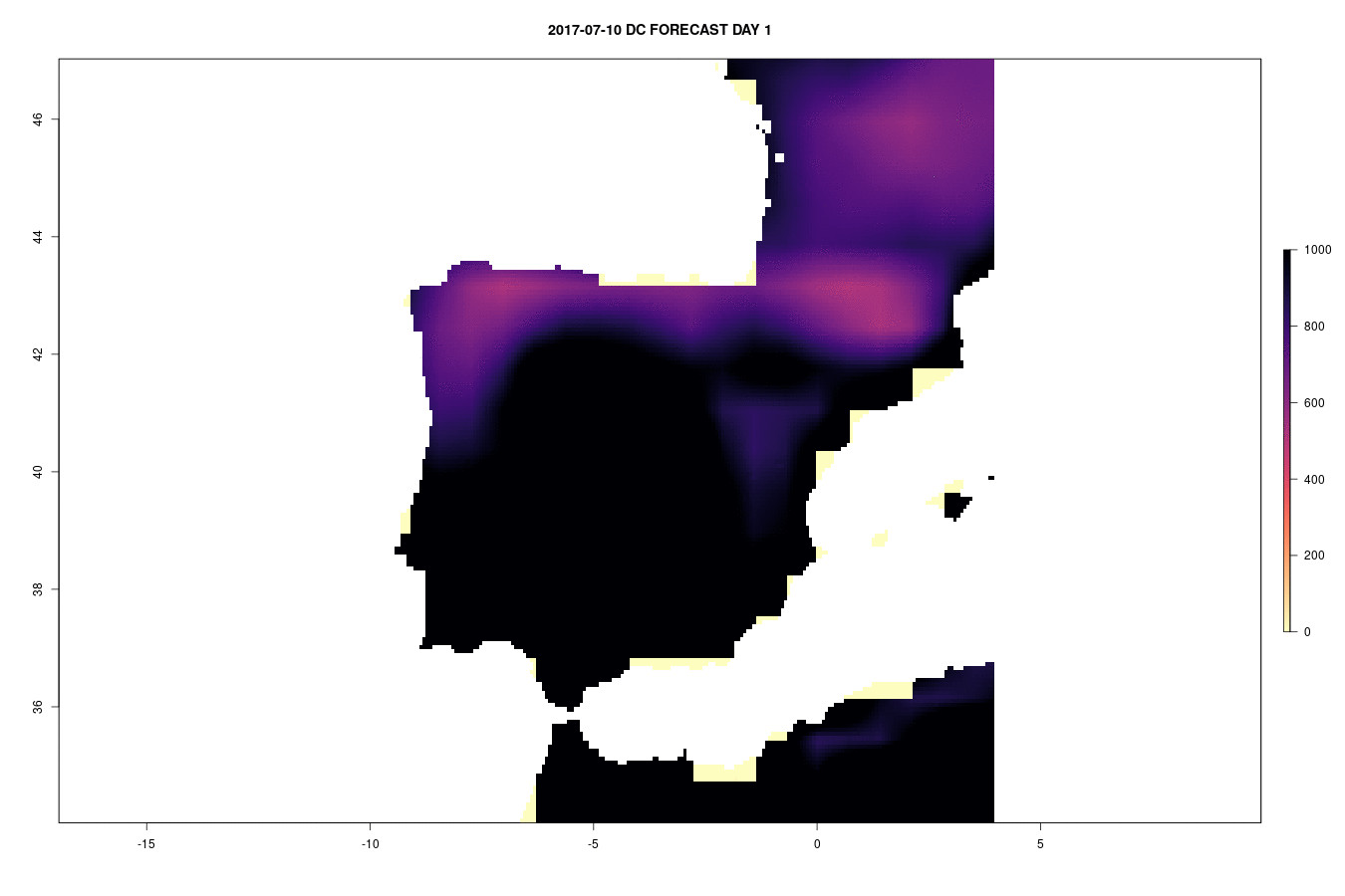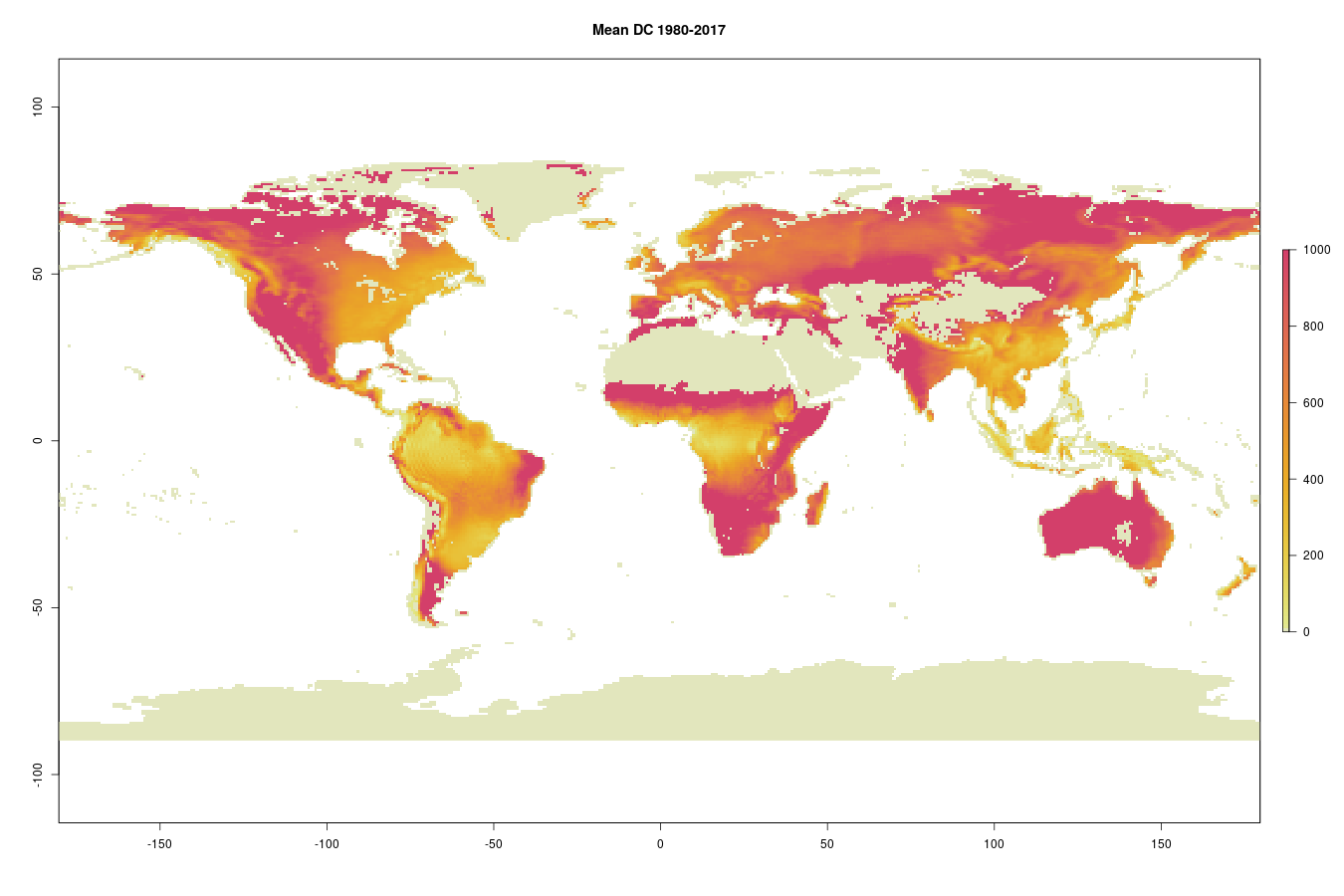 The Drought Code (DC) is a numeric rating of the average moisture content of deep, compact organic layers. This code is a useful indicator of seasonal drought effects on forest fuels and the amount of smoldering in deep duff layers and large logs. This is a variable of the Fire Weather Index rating system designed and adopted by the Canadian Forest Service. The dataset has been developed through a collaboration between the Joint Research Centre and ECMWF under the umbrella of the European Forest Fire Information (EFFIS) system and the Global Wildfires Information System (GWIS), a joint initiative of the GEO and the Copernicus Work Programs.