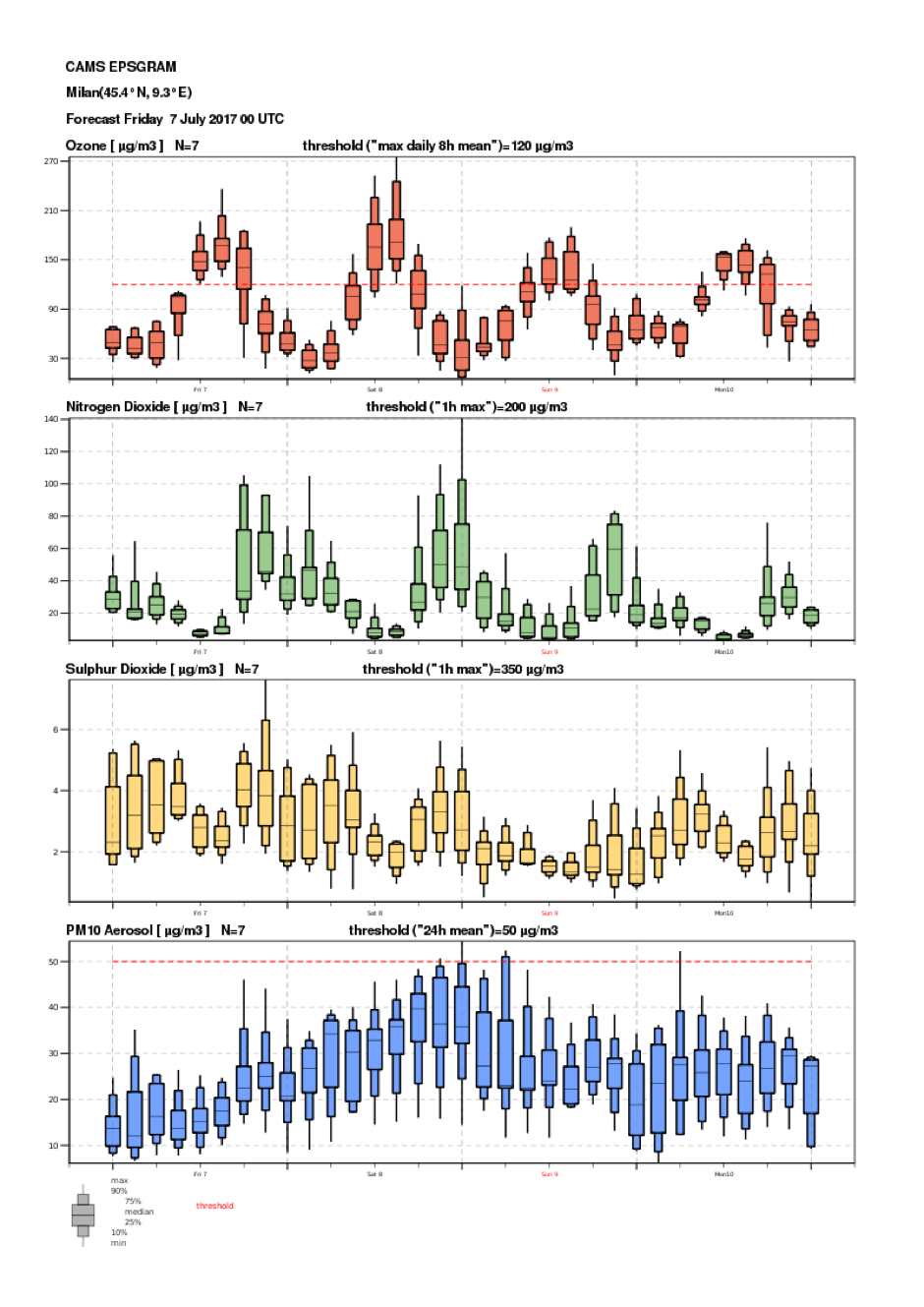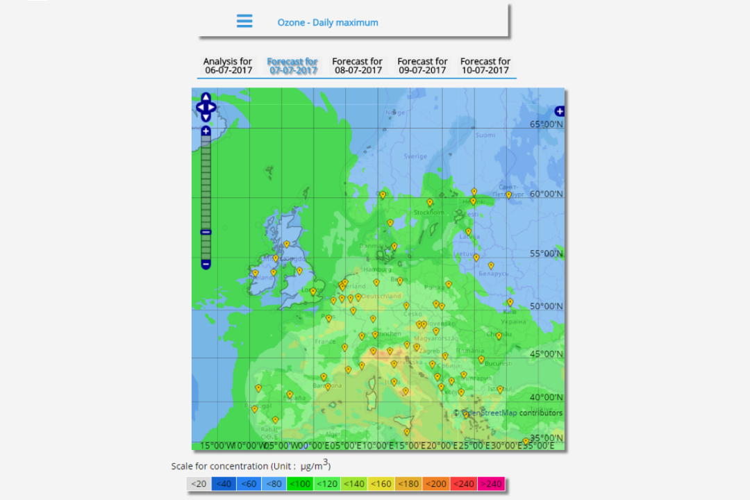 Air pollutant concentrations (ozone, nitrogen dioxide, sulphur dioxide, carbon monoxide, particulate matters below 10 and 2.5 mm) as forecasted by CAMS regional air quality (RAQ) system.