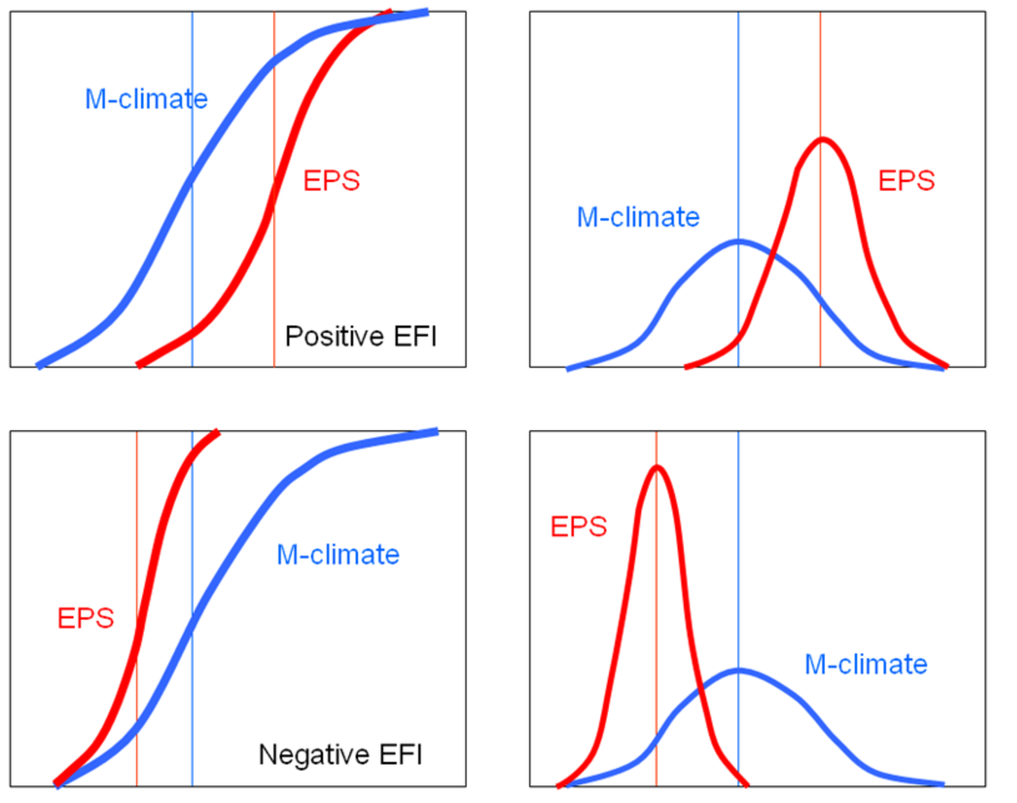 If the forecast probability distribution agrees with the M-climate distribution then EFI = 0. If the probability distribution (mean, spread and asymmetry) does not agree with the climate probability distribution, the EFI takes non-zero values. In the special case where all the members forecast values above the absolute maximum in the M-climate, the EFI = +1; if they all forecast values below the absolute minimum in the M-climate the EFI = -1.