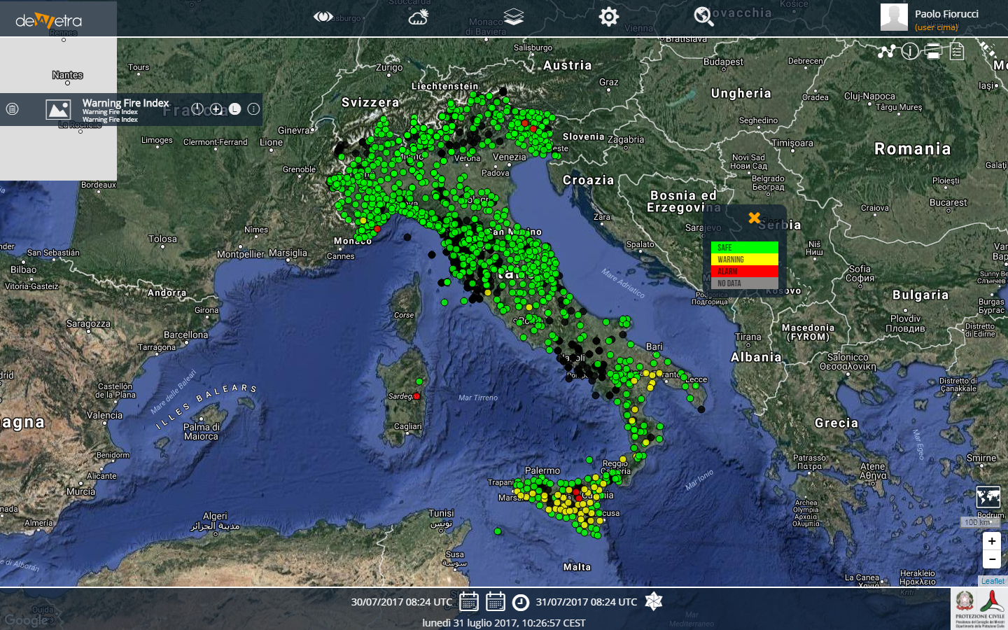 It is a product of early warning fire danger. The map corresponds to the local meteorological stations that gives early warnings discretized in classes (safe, warning, alarm, no data) referred to a specific point.
