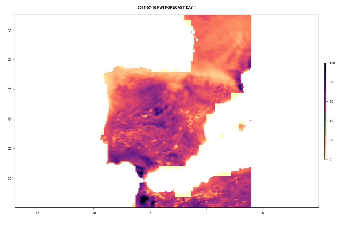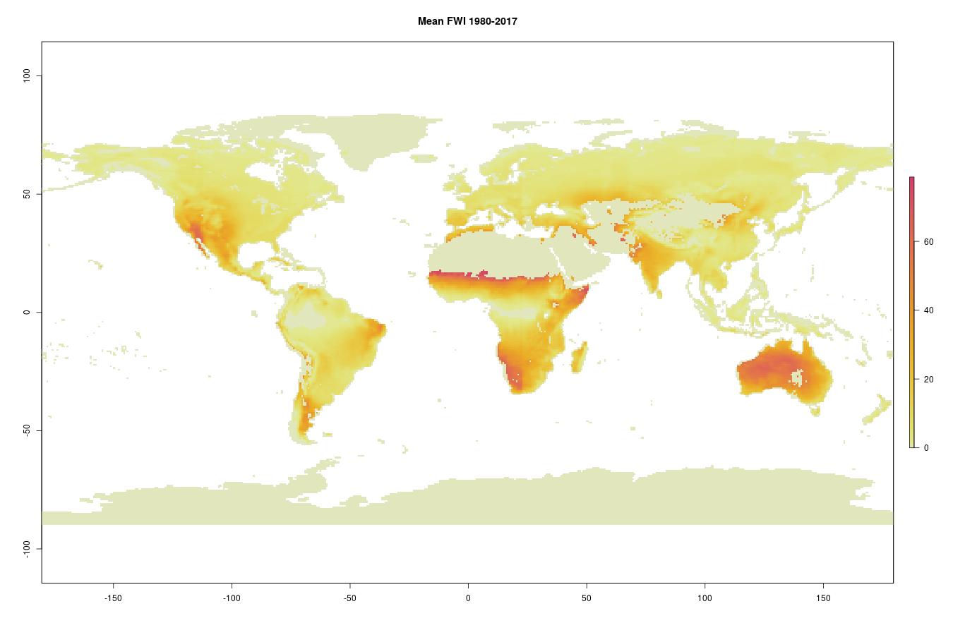 The Fire Weather Index (FWI) is a numeric rating of fire intensity, dependent on weather conditions. This is a good indicator of fire danger because it contains both a component of fuel availability (drought conditions) and a measure of ease of spread. This is a variable of the Fire Weather Index rating system designed and adopted by the Canadian Forest Service. The dataset has been developed through a collaboration between the Joint Research Centre and ECMWF under the umbrella of the European Forest Fire Information (EFFIS) system and the Global Wildfires Information System (GWIS), a joint initiative of the GEO and the Copernicus Work Programs.