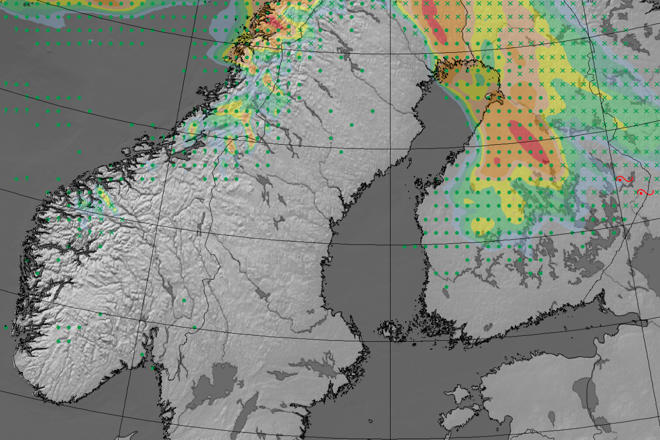 HIRLAM (High Resolution Limited Area Model) is an operational synoptic and mesoscale weather prediction model. Within ANYWHERE, the following products are available: a) wind gust speed at 10 m, b) average wind speed components u and v at 10 m, c) hourly accumulation of precipitation, c) water phase of precipitation at ground level.