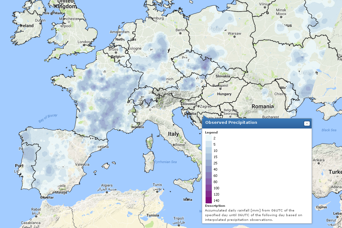 The precipitation data available to EFAS is interpolated to provide a map of accumulated precipitation for a 24h period ending at 06 UTC.