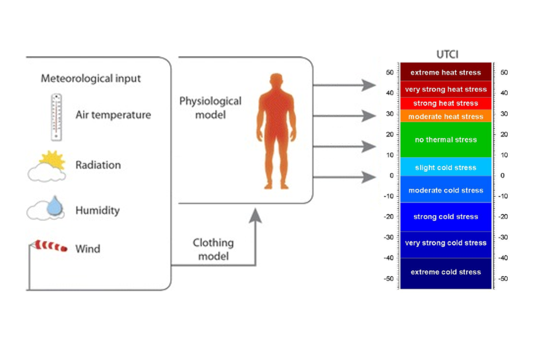 The thermal stress induced by the atmospheric environment, e.g. temperature, wind, humidity and radiation, on the human body is computed as Universal Thermal Climate Index (UTCI) via the UTCI-Fiala advanced multi-node model of thermoregulation and forecast at the pan-European scale.